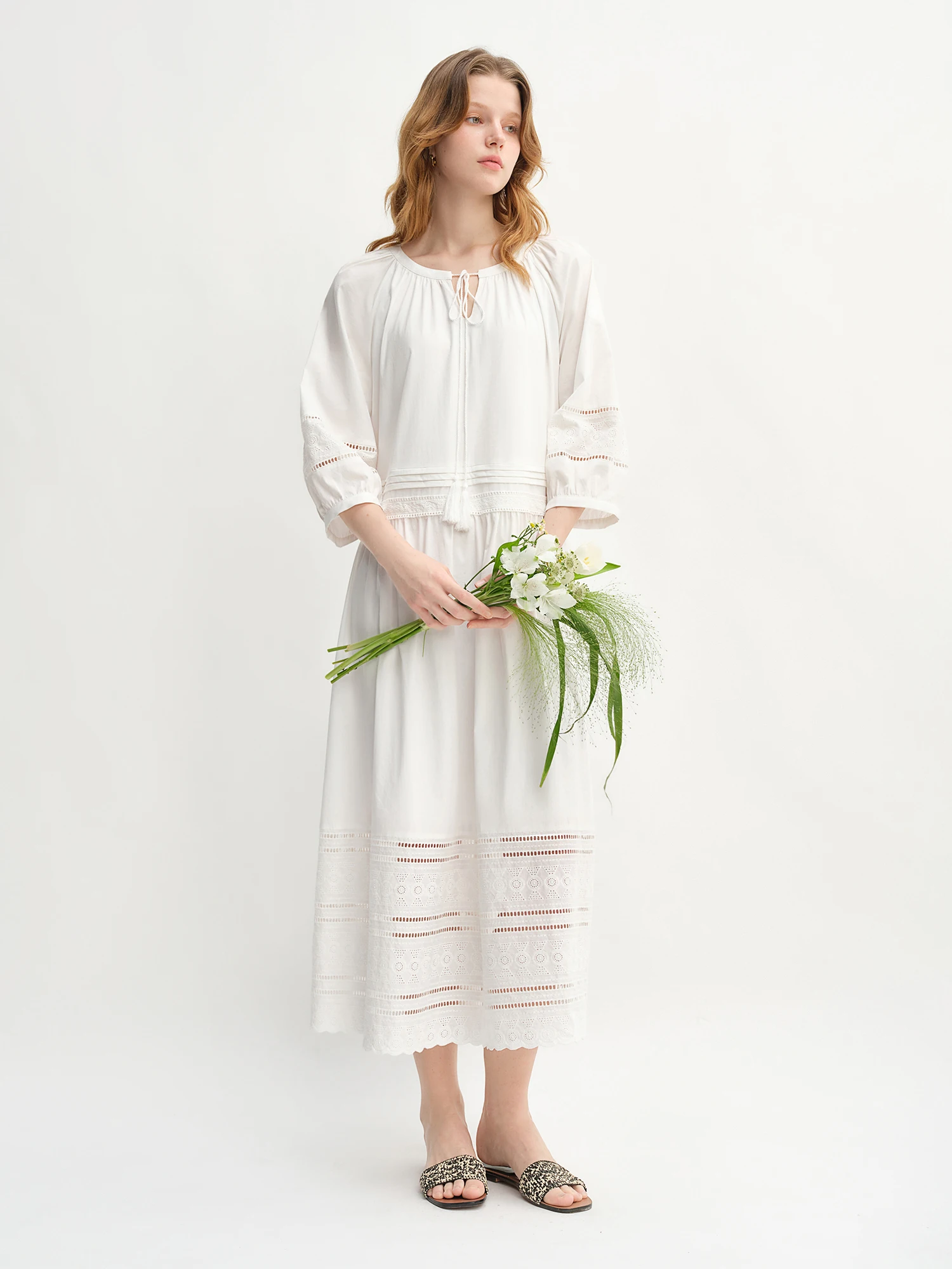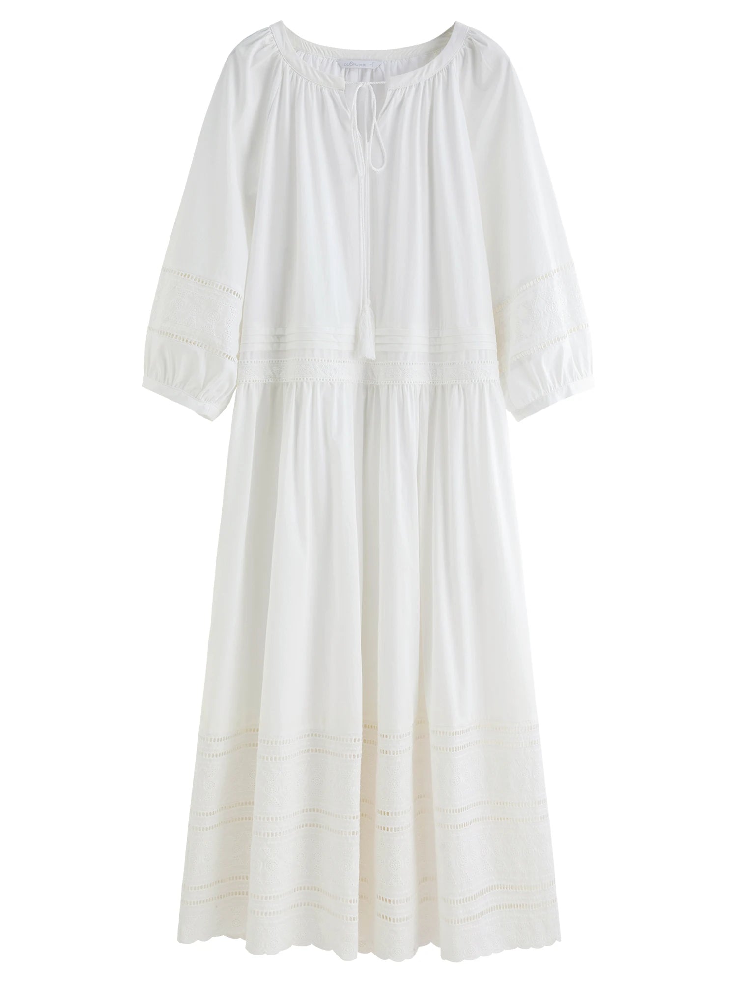 Leve, elegante e atemporal, este vestido midi em tom branco é perfeito para quem busca conforto sem abrir mão do estilo. Confeccionado em tecido suave, possui detalhes delicados em bordado na barra e nas mangas, que adicionam um toque romântico e sofisticado. O modelo de mangas 3/4 e o caimento solto tornam a peça ideal para dias quentes ou ocasiões especiais, mantendo sempre a sensação de leveza.
